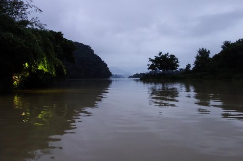 After I settled into my room, I went across the river with the intention of taking the long route up the mountain towards the World Peace Pagoda. Here I am crossing the river again, and the view of that: