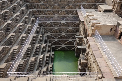 The step-well is called Chand Baori (the latter word means step-well) and it was built by King Chandra sometime around the end of the 8th century, beginning of the 9th century C.E.