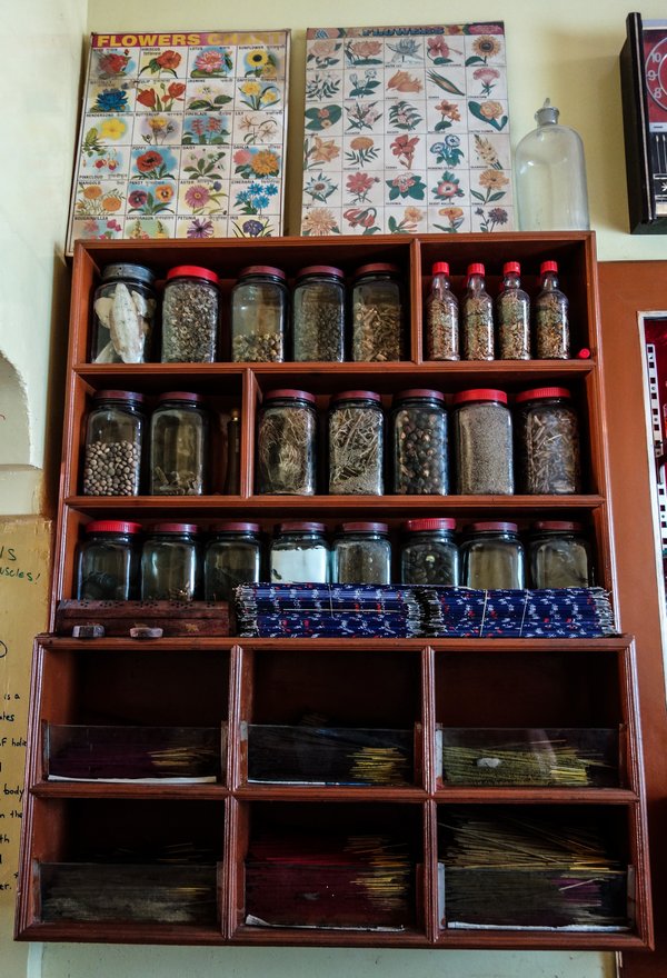 Some shots inside the oil shop. The large device at the bottom is used to crush herbs and flowers to make the oils.