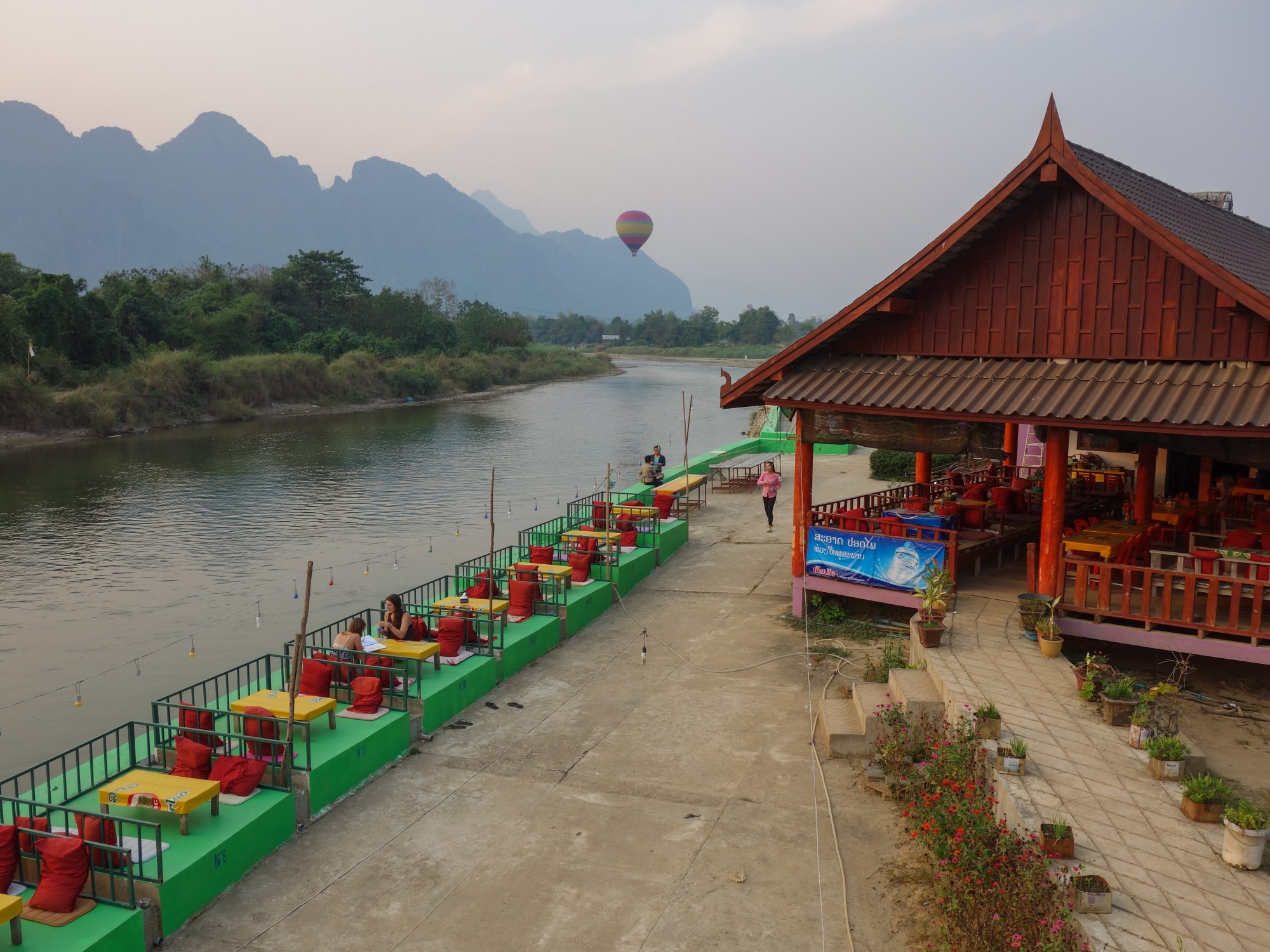 Vang Vieng has a bunch of relaxed restaurants overlooking the river. Adam was struggling to get proper sleep during his first day in the region so I spent a few hours on my own reading in a cool restaurant with a huge terrace overlooking the river and limestone mountains: