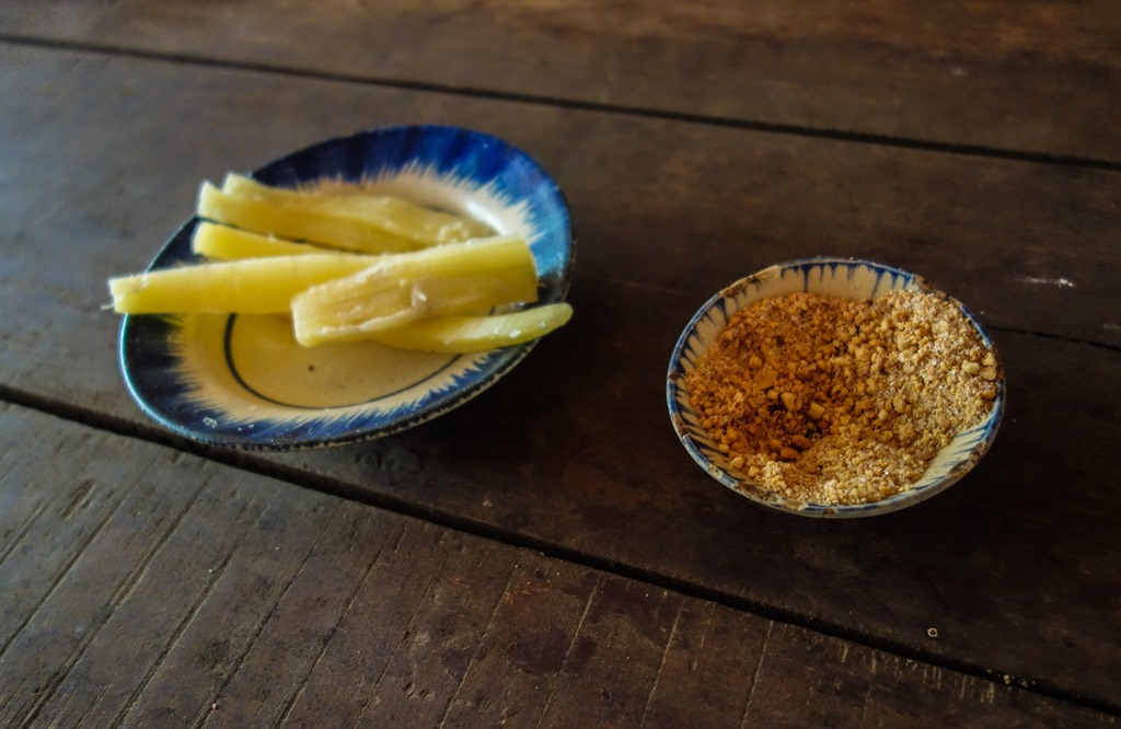 Food was always scarce during the war. One of the more popular snacks at the time was a really tasty yet simple dish: tapioca root dipped in crushed peanuts and sugar:
