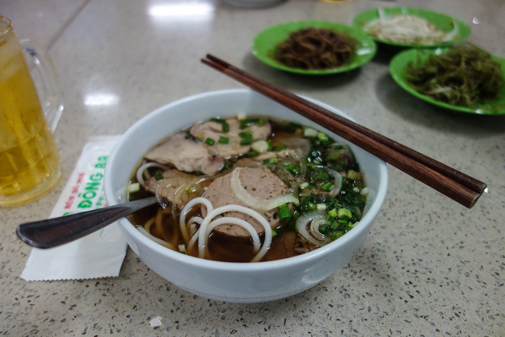 We started at a restaurant that specializes in a dish called Bun Bo Hue. As the name would suggest, the dish is from the Vietnamese city of Hue. On a quick glance it looks like Pho, but couldn’t be more different. The noodle is a thicker rice noodle, approximating the diameter of bucatini, but without the hole in the centre. The defining feature of the broth is lemongrass, but it also made with beef bones, beef shank and fermented shrimp sauce. The broth is then served with thin slices of marinated beef, oxtail and in my case slices of pork leg. The garnishes served on the side are numerous including cilantro sprigs, green onions, sliced banana blossom, mint, basil, Vietnamese coriander and red cabbage. You then squeeze in some lime juice and add fish sauce and chilli paste to suit your fancy. This was my favourite dish of the night and one of my favourites in the country as a whole. Ironically, when I sought out the dish in Hue proper, I was unable to find a restaurant that matched the one I had on the food tour: