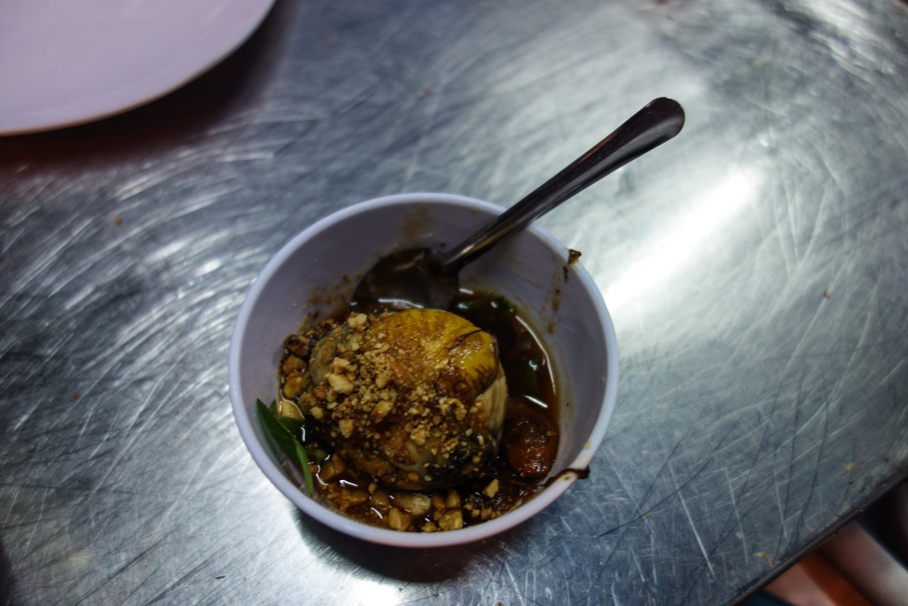 My next dish was a bit of an adventure. I’ve seen it served in Canada, but not in the way it is done in Saigon and I’ve never actually tried it. The dish was duck embryo, here served in a tamarind sauce with crushed peanuts. The dish is known as Hot Vit Lon. I actually had never realised that the egg with the duck embryo is so large—I was expecting something the size of a chicken egg and instead got something closer to 3/4 of the size of a tennis ball. I also always imagined that the duck embryo was mostly liquid, but nope it has soft feathers, bones, and a beak (all easily chewable), but most importantly it definitely looks like a tiny duck. You eat the large yolk first and then the embryo. I rather enjoyed the yolk, but then just ate the embryo as quickly as possible. I’m ashamed to say that I came pretty close to throwing up in the middle of the restaurant—and it was purely psychological, I pretty much swallowed the thing whole so I didn’t get grossed out by the bones.