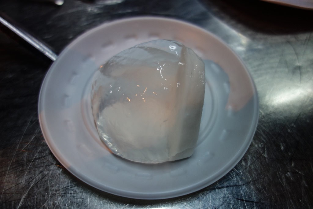 For dessert we had something I enjoyed tremendously. What they do is open a coconut along the top and pour in a seaweed based gelatine powder called agar-agar. They then place the coconut into a refrigerator to allow the gelatine to form. Once the cream and coconut water has settled into a gelatine, they cut out the surrounding meat and serve out slices of the gelatine inside, still nice and cool. The result is a delicious dessert that is not too sweet and is very refreshing in the Saigon heat: