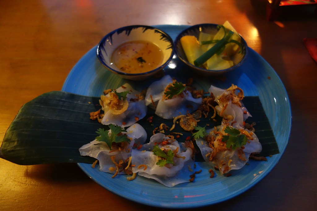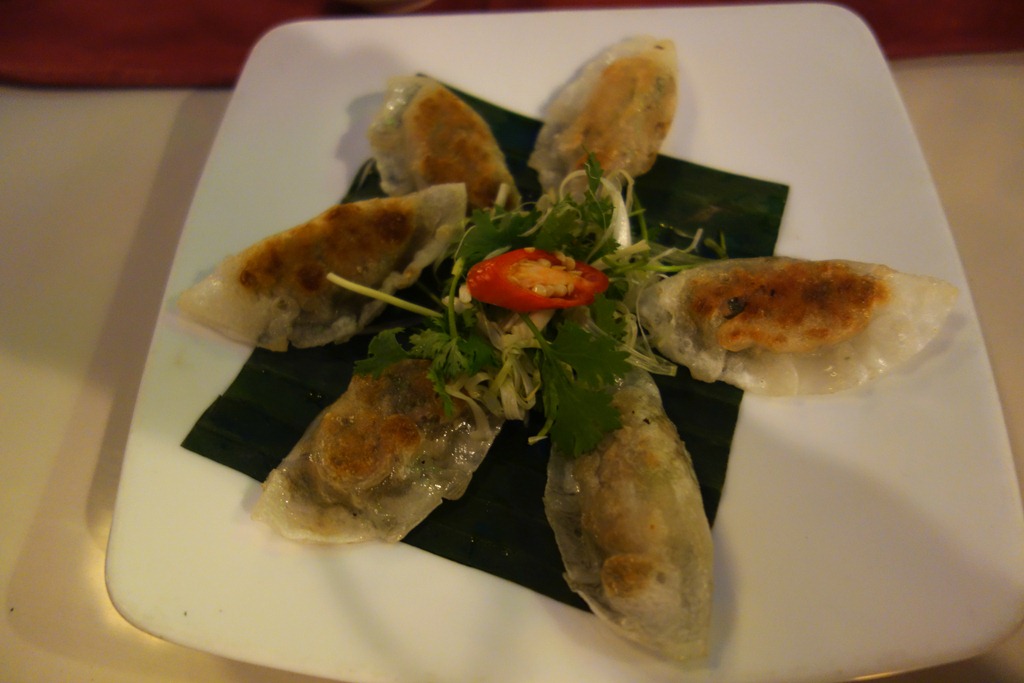 The famed white rose dumplings (banh bao banh vac) of Hoi An.  They consist of shrimp in a rice dough wonton, topped with crunchy bits of garlic and shallots, and served with a sweet dipping sauce.  Legend has it that they are all made by one family in Hoi An that holds the secret recipe: