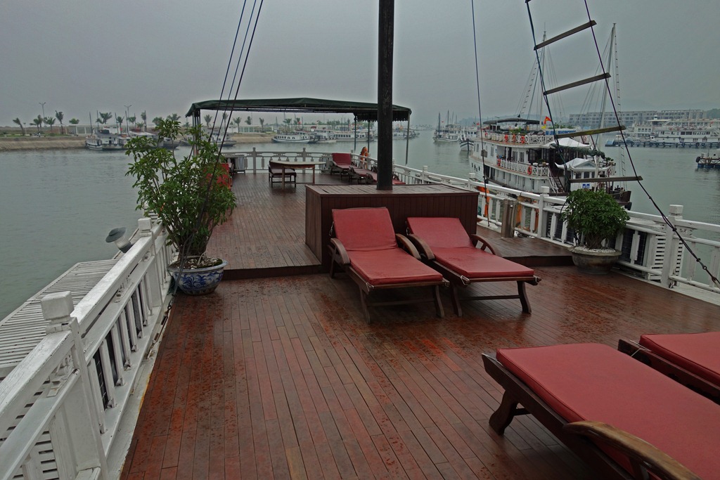The other guests on the boat were only staying for the overnight trip, so once I got to the pier I joined another group that was just arriving from Hanoi. Since we would be spending the night in Cat Ba, the second boat was smaller and had more guests. However, most people chose to stay away from the sun, in the area below, so it was relatively quiet and spacious on the top deck: