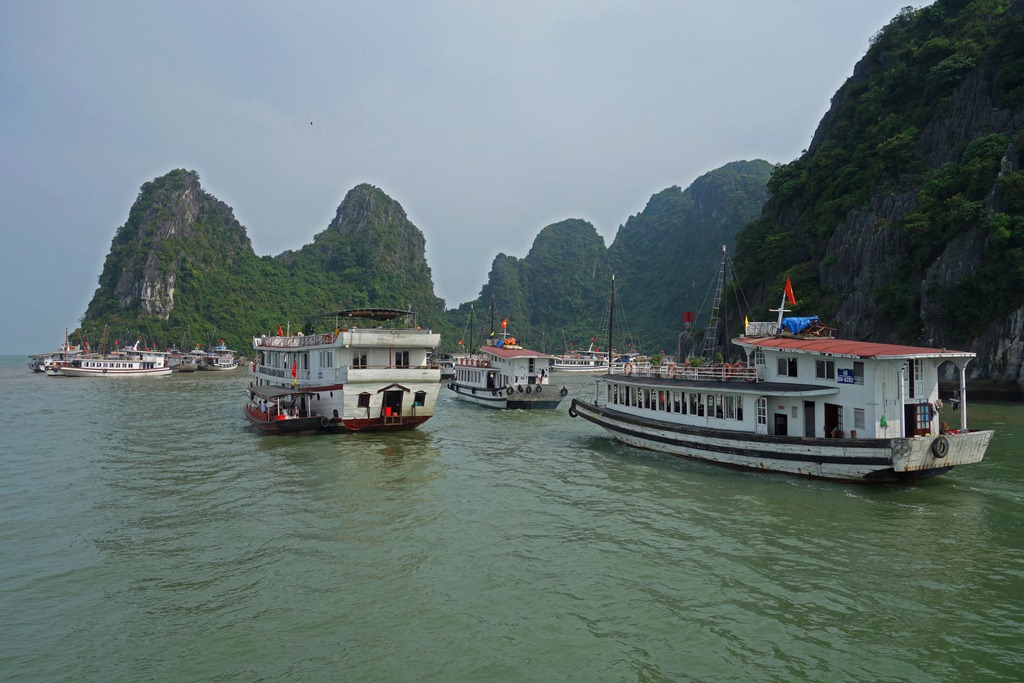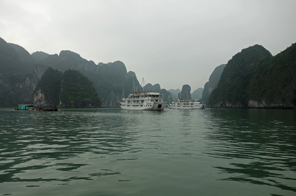 The train arrived in Hanoi early in the morning, and since the travel agency where I was being picked up was still closed I treated myself to a breakfast buffet at a fancy hotel. I didn’t have much of a choice in the matter, I was hungry and hotels were the only places open for breakfast at that time. After breakfast, a bus picked me up at the travel agency and drove us to the pier near Halong Bay. With traffic it takes a fair amount of time, about four hours.
