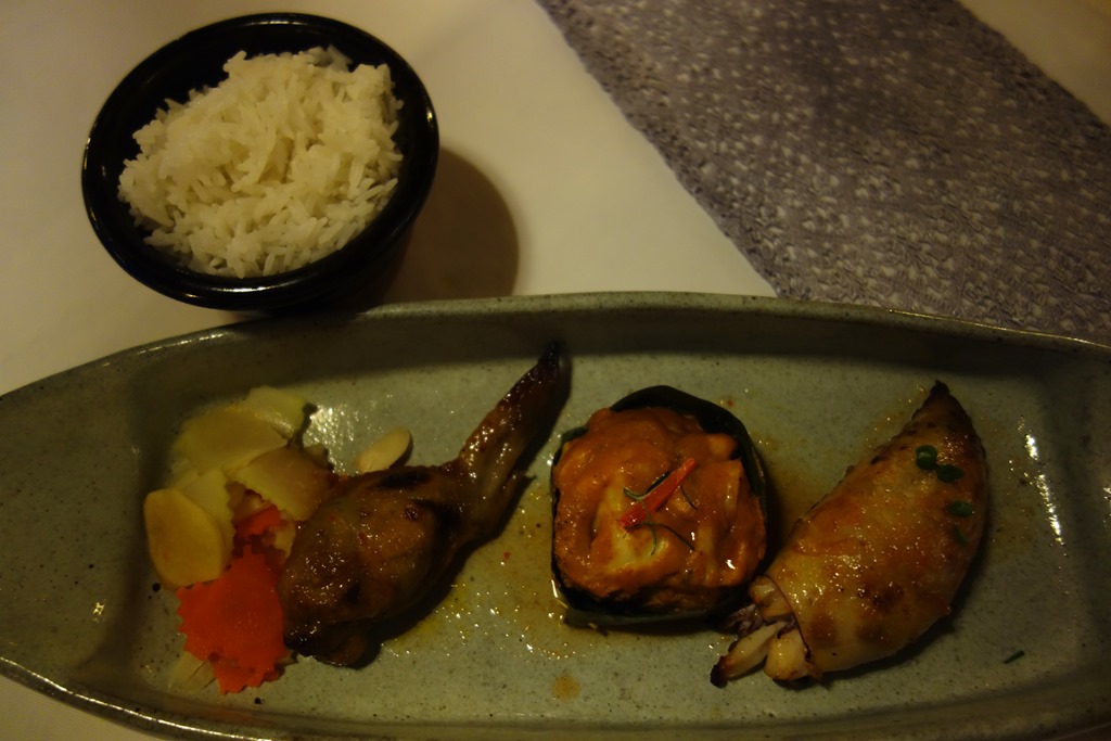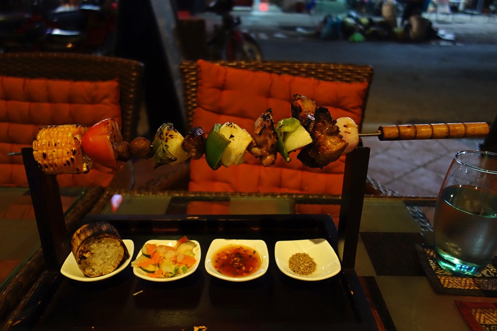While I was waiting for the travel agent to book my tickets I went off for dinner at a nearby restaurant called Dot Grill. They specialize in delicious meats (the circular bit wrapped in bamboo is sticky rice). The food was excellent: