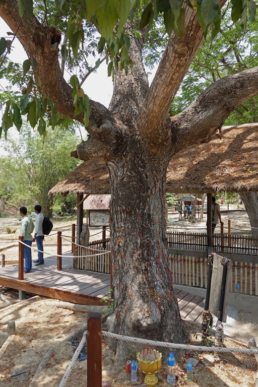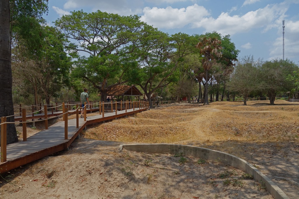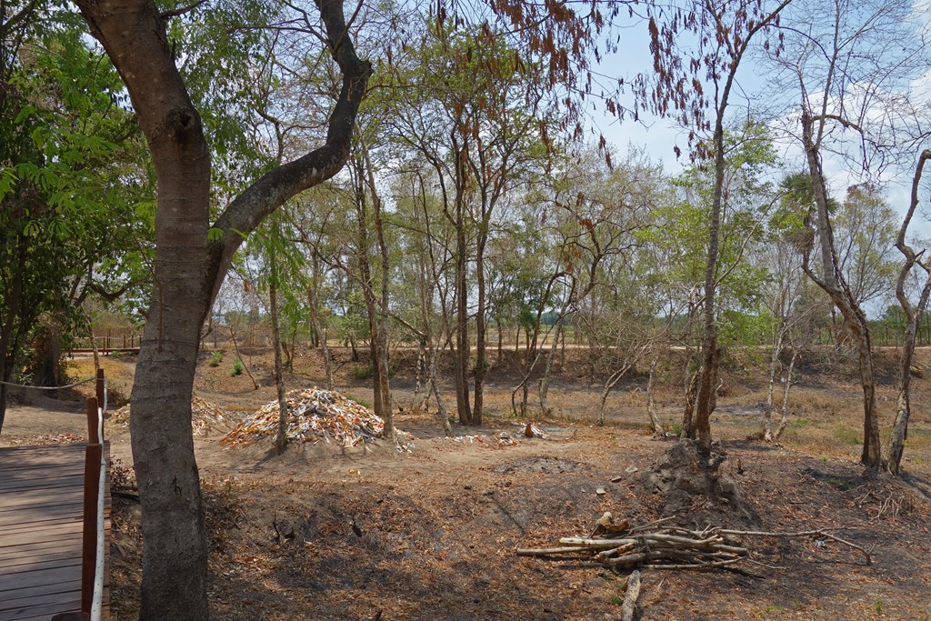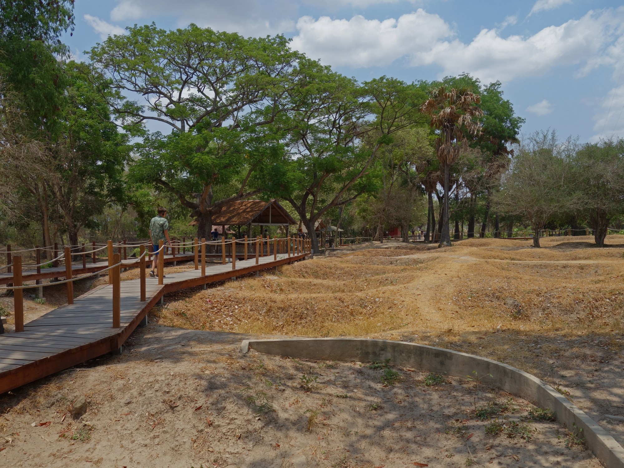 The site has so many unidentified bodies that the authorities decided to let most of them rest. If you walk around the site you’ll see a number of little hills covered in ribbons—those are mass graves. Also, because people were killed and buried all over the site for half a decade, some of the clothing and bones from unmarked burial areas get washed up during the rainy season. When you walk around I guarantee that you will see fragments of bone and clothing on the ground, I certainly did: hence the wooden walkways.