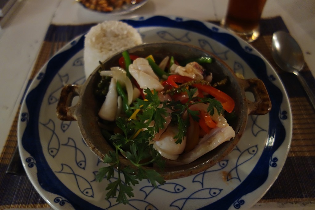 My dinner on the first night, squid in a pepper sauce (they have access to Kampot’s pepper in Kep so the food can be quite good though this squid was just mediocre):