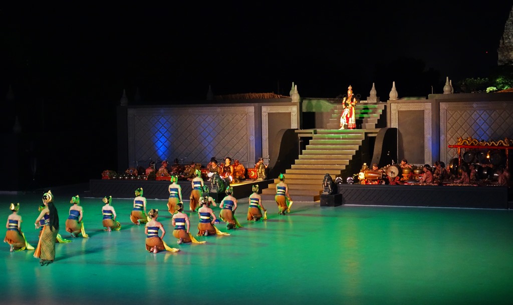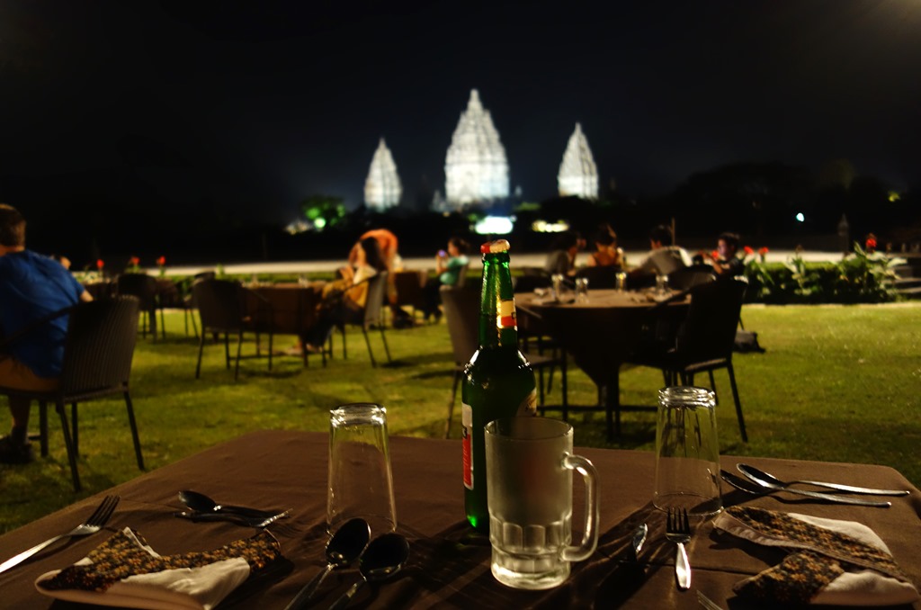 I got to the temple an hour before the show, and one of the loveliest memories of my year of travels is sitting outside at a restaurant watching the sunset over Prambanan temple, drinking a beer and listening to the gamelan orchestra playing from the theatre next door. A shot from the restaurant right after sunset and a shot of the stage at the show: