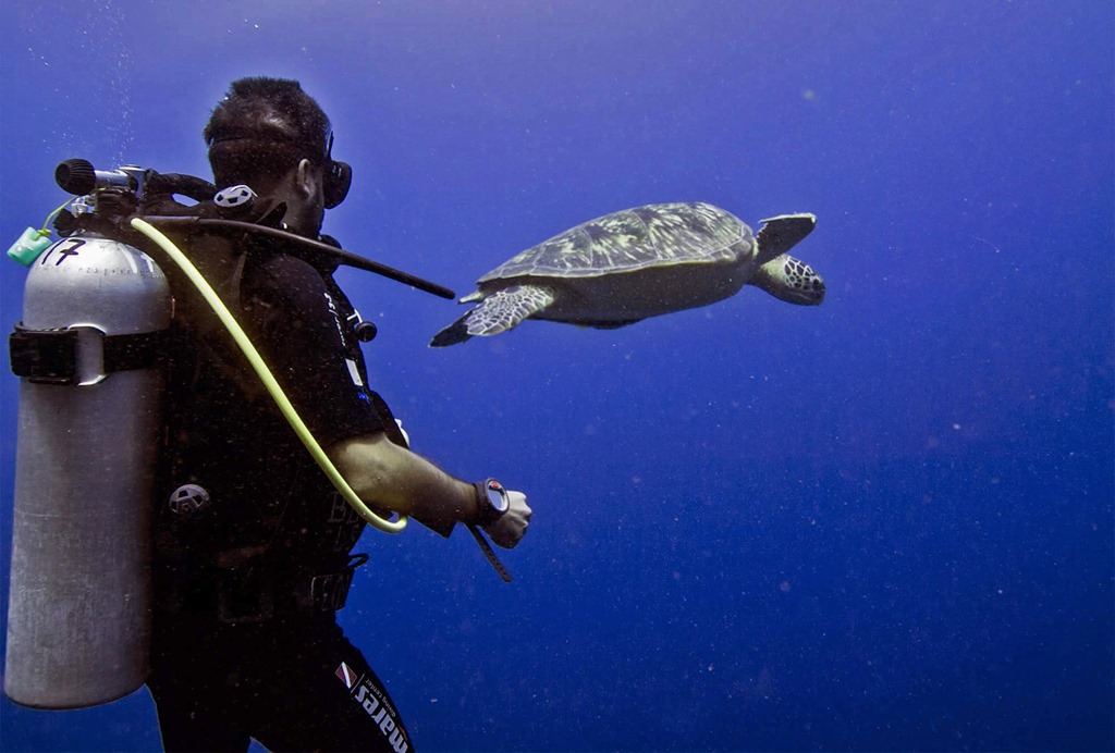The only diving picture of my time in Bunaken was taken by one of the instructors, Mika. There are a ton of turtles in the area and they love to have their backs scratched (they do it naturally on rocks), but if you encounter them snorkeling they swim away fast. However, for some reason when you’re diving, they don’t see you as a threat and let you hang out.. As an illustration, I’m told that the turtle below was a few centimeters away from my head until I turned around and noticed it.