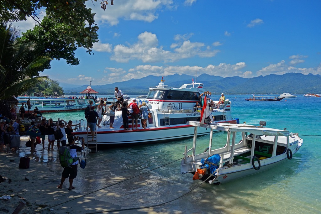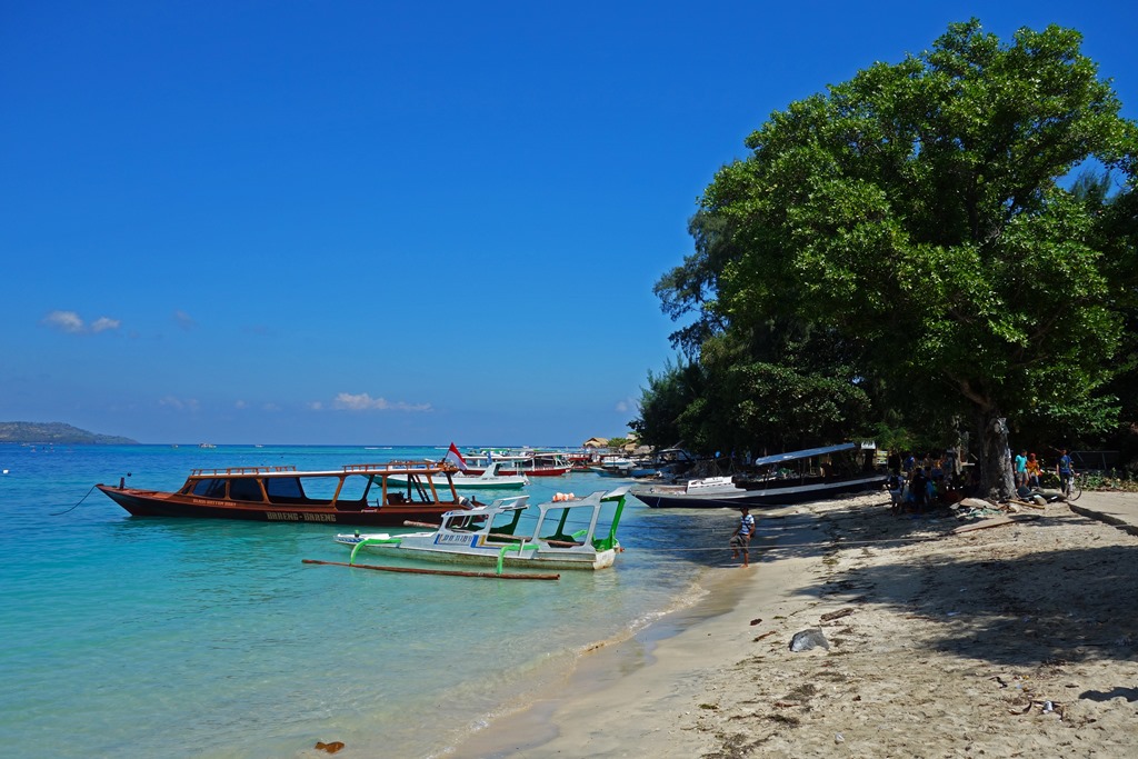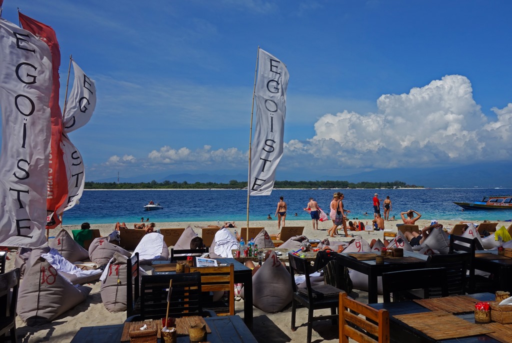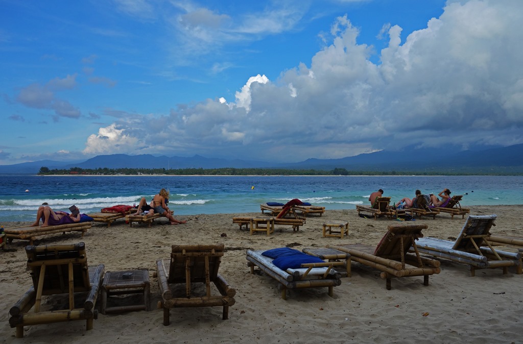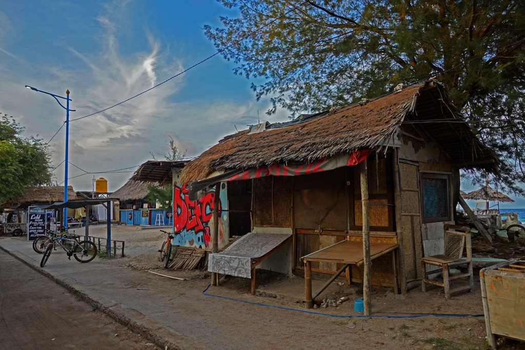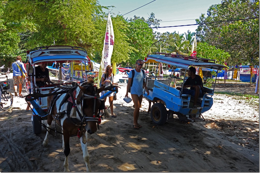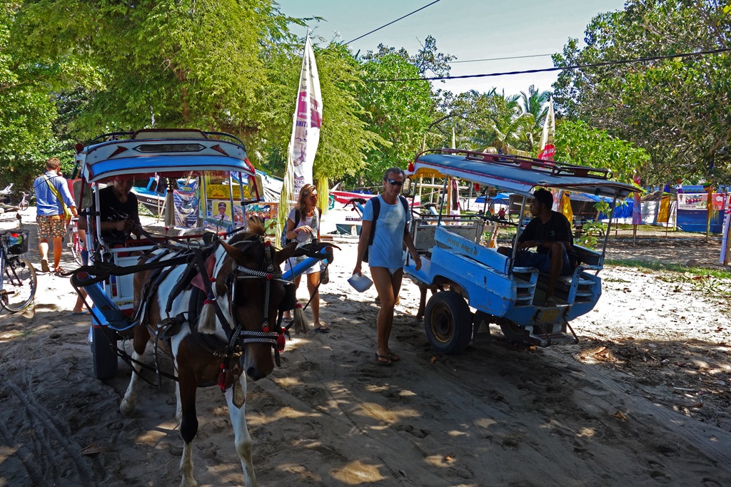 The following morning the company I had hired to take me to the Gili islands picked me up at 7:30 am to drive me to a nearby town for the fast ferry departure. The Gili islands consist of three islands, Gili Trawangan, Gili Meno, and Gili Air. If you only have time to check out the Gilis or Bali, I’d pick the Gilis. There’s nothing wrong with Bali per se, but the hotels are far more expensive, the beaches not as nice, and there’s quite a bit of traffic on the main road by the water. In contrast, you can find very reasonably-priced cabana-style accommodation on the Gilis and since motorized vehicles are not permitted on the islands, they are a lot more peaceful. Another interesting thing about the Gilis is that there is no overt police presence on the island. It is said that there are undercover agents roaming the islands, but issues related to crime are generally settled by the local councils and by village elders.