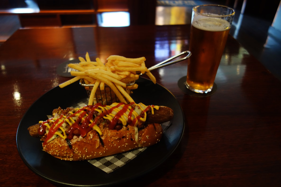 I walked around the downtown core for a bit to get a sense of the city and I was able to locate a good shop to buy two great sweaters at fairly reasonable prices. I then stopped at one of the chain pubs, the Generous Squire for some lunch and light reading. In case you’re curious, this is what an $11 pint and an $18 hot dog (the cheapest main on the menu) look like: